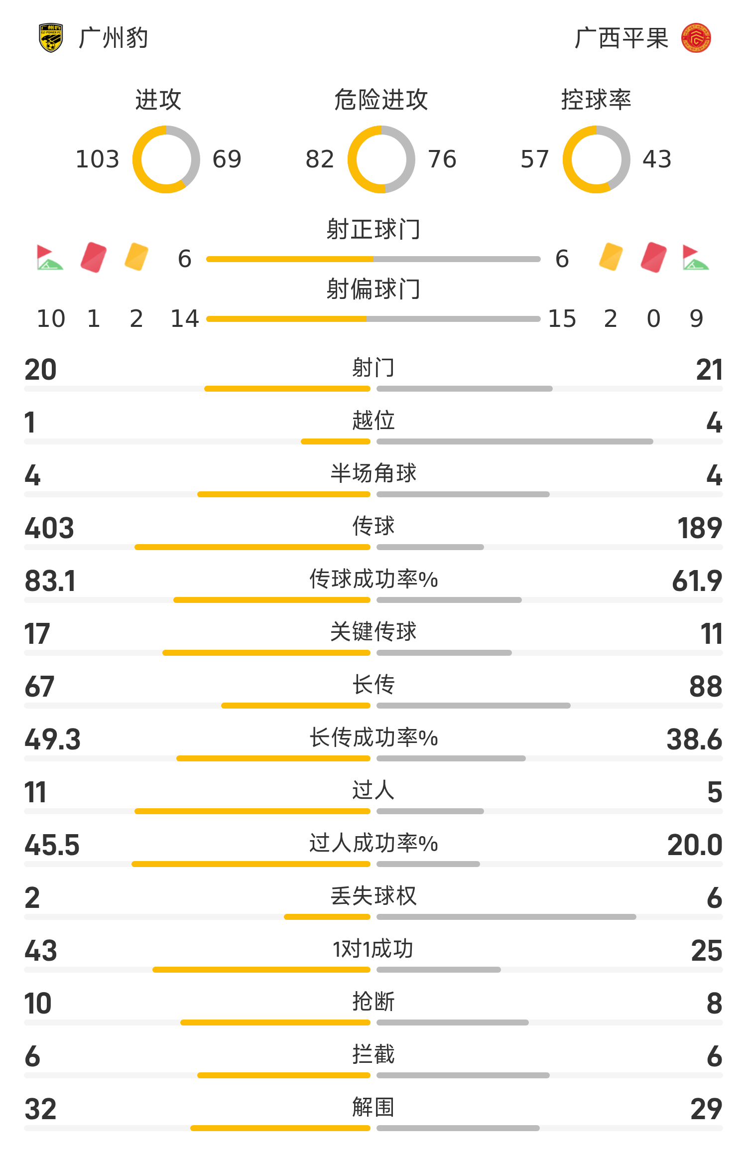 广州豹首发阵容:1-陈钊、5-姜积弘、2-陈国良、25-王建明、11-尼康(82’6-段云子)、34-候煜、27-吴星宇(88’26-马俊亮)、42-杨浩(77’21-崔星隆)、20-罗萨(82’37-商隐)、10-梁学铭(62’3-韩轩)、7-卡洛斯(77’9-夏达龙)
